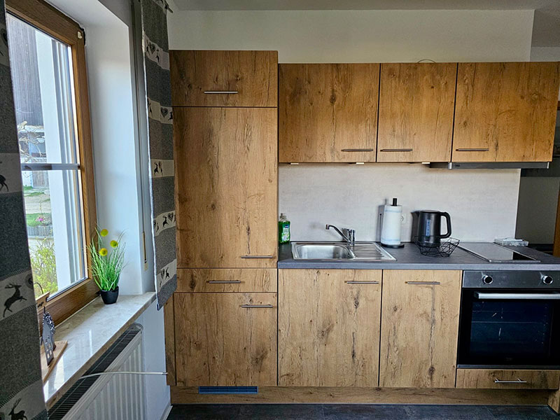• Große Küche mit Essbereich (Elektroherd, Backofen, Kühlschrank mit Gefrierfach, Wasserkocher, Kaffeemaschine, und Geschirr inkl. Kochgeschirr und Reinigungsmittel)